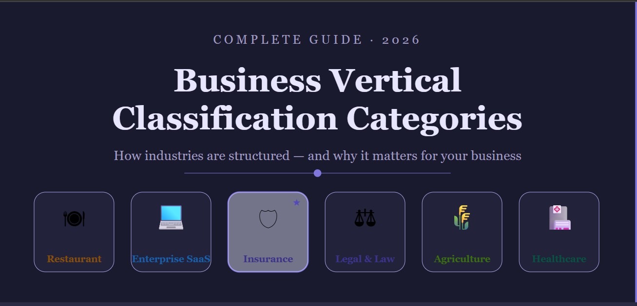 A business vertical classification category is a structured segment of the economy where companies share a common customer base, regulatory environment, operational model, and problem set. Examples include healthcare, legal services, agriculture, financial services, and hospitality.